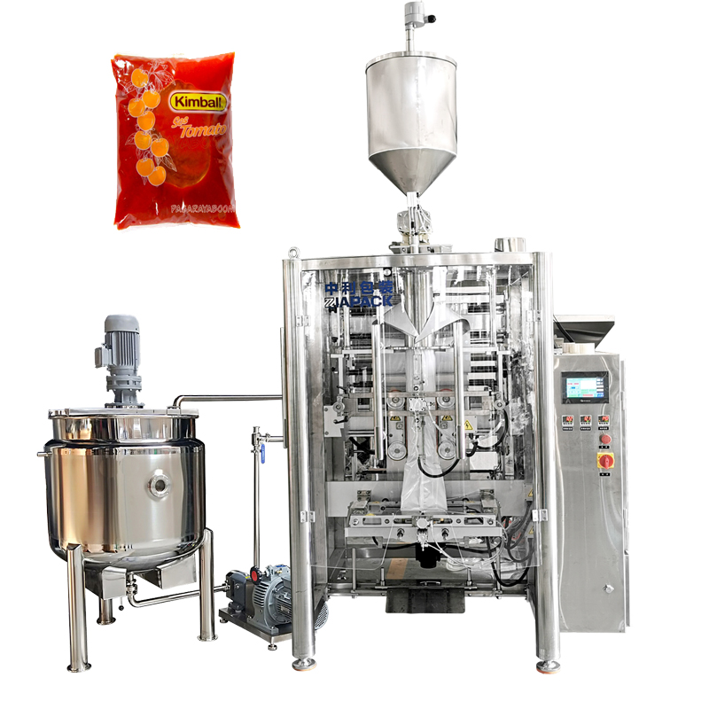 Automatisk måle volum, lage poser, fylle, tette, skjære, skrive ut lotnummeret og kutte enkelt rivehakk, ferdig produkttransport. Gjelder for væskeproduktet.