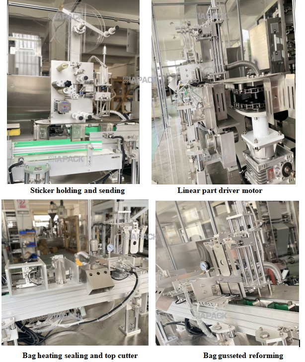 This machine is special design for make the gusset bag with top labeling .After the full bag with product drop on this machine .This machine will carry the bag ,go through one time bag mouth folding and then stick the label.The machine frame made by SUS304 .PLC and touch screen adopt by Siemens brand .And Pneumatic parts adopt SMC brand .Main Electrical components adopt Omron and Schneider brand.This machine is working with automatic packaging machine to reach the finished bag top labeling .This machine can automatic reach the function of the label separated ,Label sending .Label detector and label pressing .