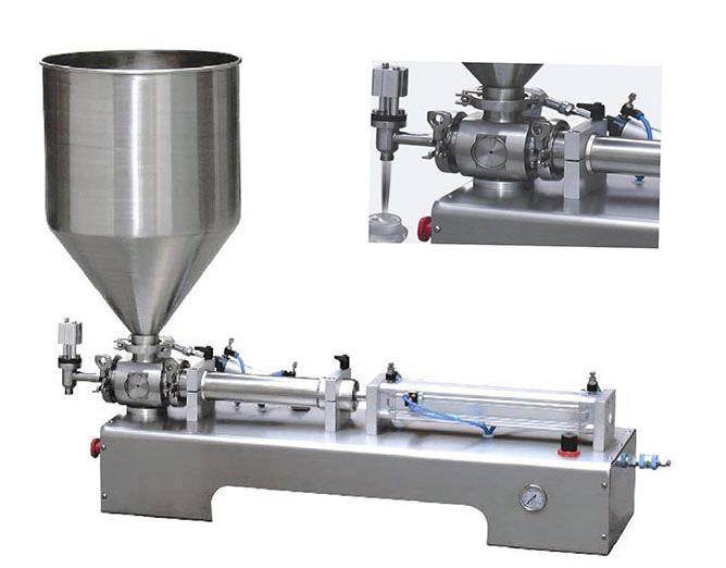 Horisontalt enkelthode stempelfyller for viskøs væske, som ketchup, majones, krem, smør, syltetøy, honning, sjampo etc.