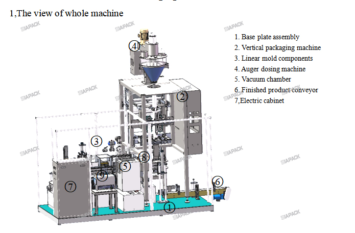 Bag forming→bag picking→cutting→vibration→shaping and pre-sealing→vacuumizing→bag dropping and pushing→finished product delivery
