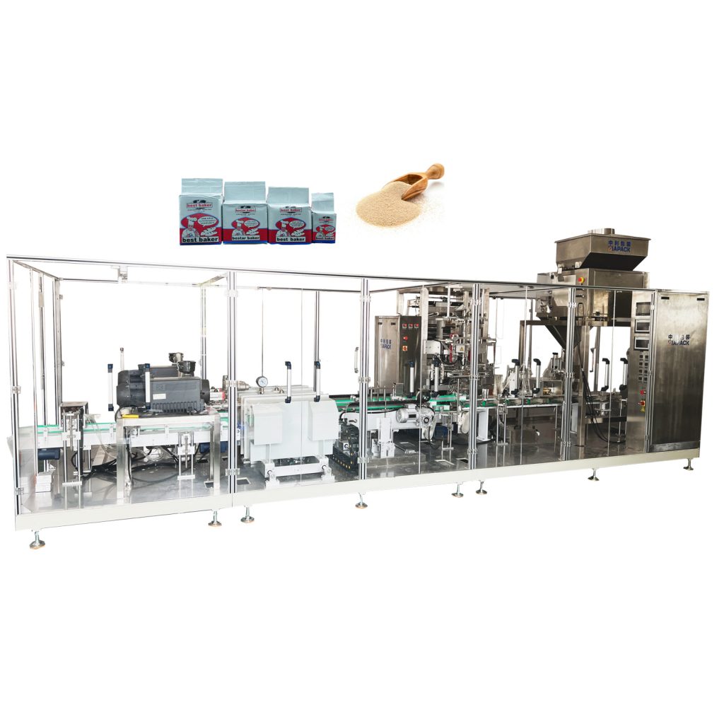 This machine including one set ZK3 vacuum elevator for feeding the dry yeast, one set ZL520 vertical bag making packing and sealing machine.one set ZLC4-2000 four buckets weighing machine, One set ZL-100V2 Double vacuum chamber packing machine. This machine are widely use for packing food pharmacy chemical and other product in powder or small granule. Like coffee powder, yeast powder wheat flour and so on .The whole machine adopting inside pumping to vacuum product. The vacuum degree is very high and packing speed is very high can be reach30bag/min .The finished product have a long shelf life and pretty shape .